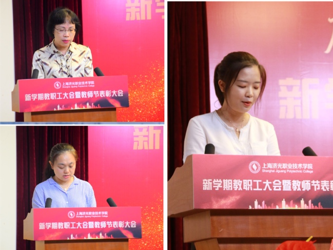 为激励教职员工对学院教育事业做出的贡献,学院四位院领导对2020-2021学年获得市级以上荣誉的教师代表进行表彰,对获得校内“优秀教师”、“优秀辅导员”、“先进教育工作者”进行了颁奖。全院教职工集体观看了《上海济光职业技术学院2020-2021学年教书育人成果巡礼片》,一帧帧画面记录了一年来学院全体教职工踏实行进在育人之路上,坚守初心、砥砺奋进的育人成绩。优秀教职员工认真从教、热情服务、甘为人梯的情怀和信仰,感染和激励着现场每一个人。