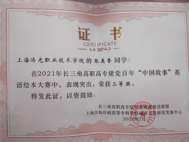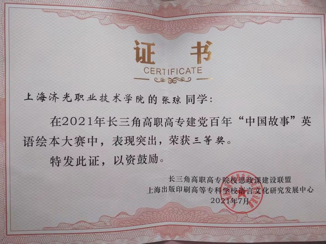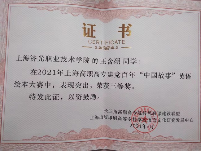 由长三角高职高专院校思政课建设联盟主办,上海出版印刷高等专科学校语言文化研究发展中心承办的建党百年“中国故事”英语绘本大赛于7月底圆满结束。此次比赛有江浙沪12所院校参赛,共40余件有效作品参加角逐。大赛组委会邀请了来自思政、语言和艺术三个领域的全国知名专家进行匿名评审,经过选拔,我院共有5名同学的作品进入决赛。