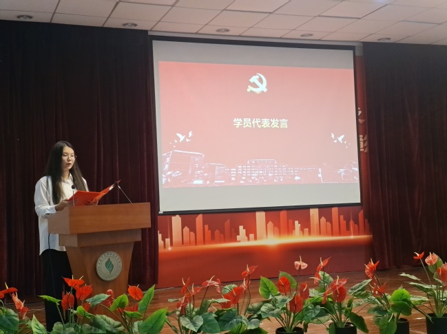 开班仪式在庄严的国歌声中拉开了序幕。经管系苏萱同学代表全体学员进行了发言。她表示,全体学员将认真贯彻执行党校安排,遵守党校纪律,主动学习交流,课后总结反思,不断提高思想觉悟,把思想追求和实际行动有效结合。