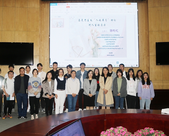 游昀之老师以《马克思主义“人的本质”理论对人生的启示》为主题深刻阐释了人的本质,通过举例、提问的方式启发学生深层次思考人生真谛。她从人的本质属性讲起,运用古今中外思想家们对人的本质进行定义的观点,引出马克思主义关于人的本质是一切社会关系总和的定义;随后采取图片、视频的形式启发学员们思考“为什么要探讨人生”、“如何过好一生”等问题。她通过解析我国城市中的“三和青年”现象,指引学生思考“为什么要确立正确的人生观”,以通俗易懂的社会实例、平易近人语言深入浅出地给学员们讲解分析了马克思主义“人的本质”理论。讲课过程中游老师与同学们不断互动,在教与学的探讨过程中让青马学员获得诸多关于人生真谛的思考。
