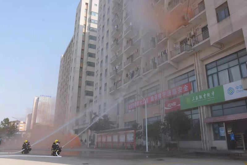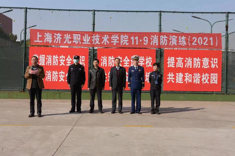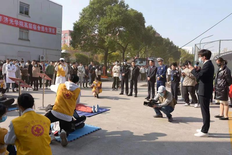 为贯彻落实习近平总书记关于树立安全发展理念、健全公共安全体系、完善安全生产责任制的重要指示精神,进一步提高我院师生员工的安全防范意识,增强应急自救能力,确保校园的消防平安,我院于11月15号在宿舍1号楼广场举行了消防安全应急演练,并邀请市教委后保处副处长贺小虎、宝山区消防队副支队长熊彦哲、杨行镇政府安全办主任严良、宝山区杨行镇派出所副所长曹政、宝山区反恐支队王君娥到场观摩,学院党委书记姜富明、副院长王云飞、后保处相关人员参与本次演练。