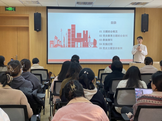 党史教育主题班会是高校开展思想政治教育的重要组成形式,是组织开展大学生德育活动的有效手段,也是管理班级的有效途径。张昂老师从主题班会的价值、主题班会的选题对主题班会进行了概述,接着从学情分析、教案撰写、班会实施过程、总结升华、注意事项几个方面介绍了辅导员如何开展党史教育主题班会。张昂老师为辅导员展示了他获得“2021年同济大学辅导员班会设计比赛一等奖”时的直播片段,分享了他当时的设计思路、准备过程及比赛现场情况,为我校辅导员团队的主题班会探索带来了有益的借鉴和指导。最后,毛燕静部长作了总结发言并对辅导员主题班会的长期规划提出了新要求。