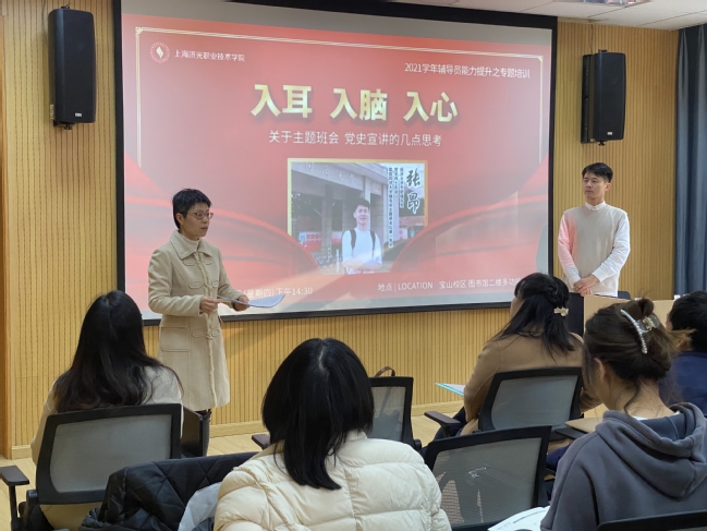 在热烈庆祝中国共产党成立100周年的氛围下,学工部筹备举办2021年度上海济光职业技术学院辅导员党史学习教育主题班会设计比赛。12月9日下午,同济大学张昂老师应邀来我院为学院辅导员进行赛前现场指导,作“入耳 入脑 入心 关于主题班会和党史宣讲的几点思考”的主题培训,示范如何上好一次生动有效的党史教育主题班会。各二级院系书记及所有专兼职辅导员参加了培训,培训由学工部部长毛燕静主持。