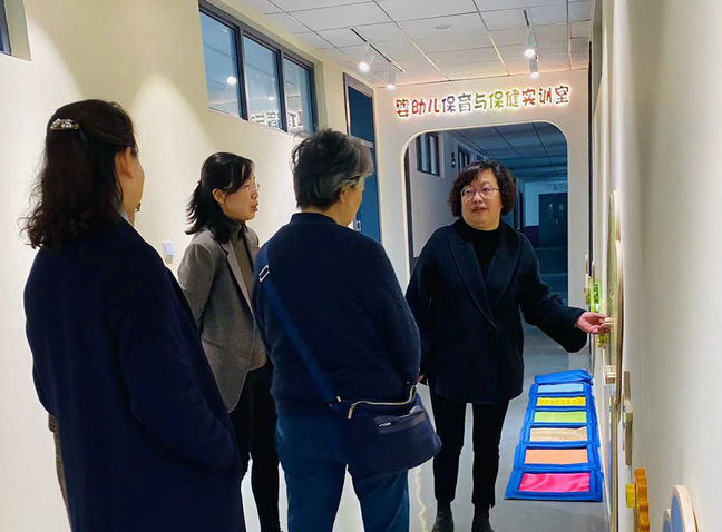 会后,在专业主任金晔带领下,与会专家们先后对婴幼儿保育保健实训室、“云游园”校企(园)网络资源通、舞蹈教室、电钢教室等建设项目进行了实地查看。金老师重点就婴幼儿实训室和云游园两大项目的设计理念、功能定位、运行管理等作了全面细致的专业讲解,并对部分功能作了现场操作和演示。