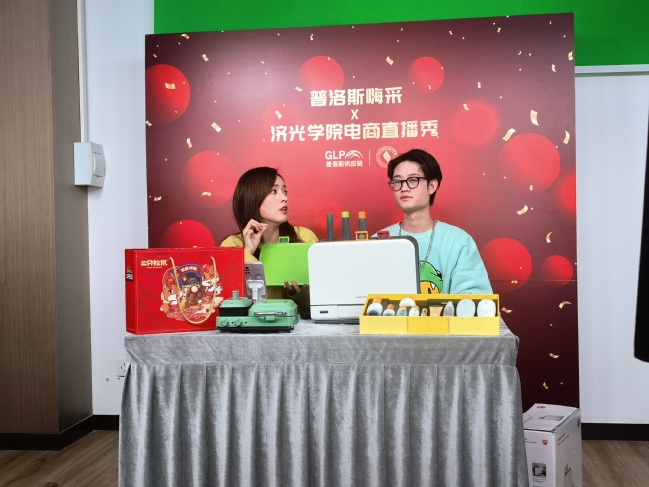 2021年12月30日,经管系电子商务专业与普洛斯·嗨采平台合作,共同呈现了一场精彩的《走进校园,新年送礼》元旦直播秀。本次直播在经管系商务运营管理实训基地举行,上海星工文化传媒有限公司范勇斌先生及普洛斯电商部领导与经管系教师们来到现场共同指导学生。本次直播总时长两个小时,通过普洛斯嗨采平台小程序向普洛斯注册会员进行直播推广,济光学院电子商务专业的5位学生与嗨采平台主播梦梦配合流畅自然,表现优异,共讲解商品26个,累计观看人数1339人,累次观看次数5544次, 点赞次数11024次。在元旦狂欢直播现场,企业领导以及系部领导、电商专业主任给直播同学们加油打气,大家都倍受鼓舞。此次活动从项目确立到成立学生直播兴趣小组、明确人员分工、确定选品、撰写与修改文案、模拟直播、企业培训,最终顺利完成直播充分实现了校企合作,协同育人。让学生直接参与企业项目运营,真操实干,在实践中提升自己的职业技能。学生在老师和企业专家的带领下,从不敢尝试到最后镜头前的坦然自若,深刻了解到了团队合作的力量,为自己的未来努力加油鼓劲。