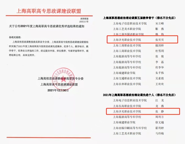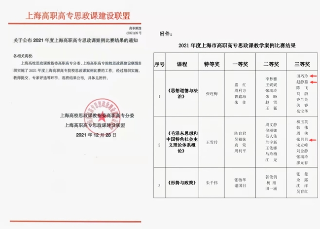 赵静茹老师提交的论文《党史融入高职高专思想政治教育的对策思考》经学校上报、专家评审荣获上海市高职高专思想政治教育优秀论文“三等奖”。田巧玲、赵静茹老师获得《德法》课案例设计三等奖,张贝贝老师获得《概论》课案例设计三等奖。张静老师荣获“2021年度上海高职思想政治理论课先进个人”称号,张贝贝老师荣获“上海高职思想政治理论课第五届教学骨干”称号。
