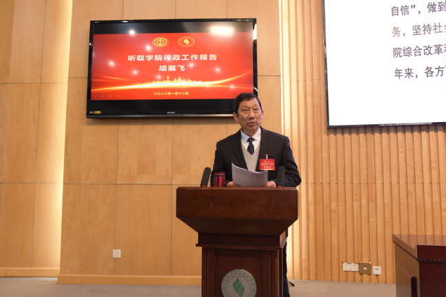胡展飞校长作2021年学校行政工作报告,他从八个方面回顾了2021年学校各项工作取得的成绩,提出了存在的问题和面临的挑战,并部署了2022年六点主要工作任务。