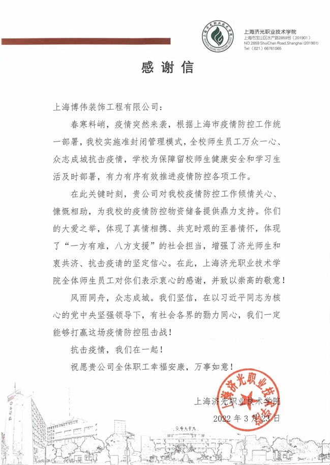 为支持我校疫情防控工作,以实际行动助力留校师生健康安全和学习生活,建工系2019届工程造价专业毕业生施俊的家长所在公司上海博伟装饰工程有限公司向我校捐赠防疫物资。在此关键时刻,为我校的疫情防控物资储备提供鼎力支持,体现了真情相携、共克时艰的至善情怀,体现了“一方有难,八方支援”的社会担当。学生家长对学校的关心与支持也进一步增强了济光师生和衷共济、抗击疫情的坚定信心。