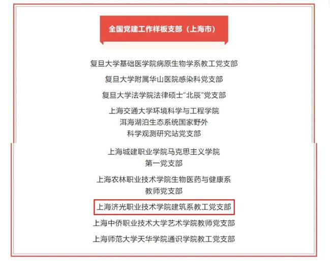 近日,教育部印发《教育部办公厅关于公布第三批全国党建工作示范高校、标杆院系、样板支部培育创建单位名单的通知》(教思政厅函〔2022〕4号),公布遴选产生的11个全国党建工作示范高校、100个全国党建工作标杆院系、1000个全国党建工作样板支部培育创建单位。上海共有2所高校入选全国党建工作示范高校,3个二级院系入选全国党建工作标杆院系,42个基层党支部入选全国高校党建工作样板支部。我校建筑系教工党支部成功入选“全国高校党建工作样板支部”。
