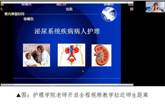 守好教学阵地、不忘传递“云”关爱。护理学院积极准备、克服困难开展好线上教学活动。在线教学期间护理学院每天的到课率均为100%,这个数字的背后少不了辅导员和任课老师的功劳。辅导员们都到寝室监督每位学生登录系统上课,任课老师也提前20分钟开启雨课堂确保同学们能准时签到上课。这次护理学院开展线上教学的一大特色就是全体授课教师积极使用雨课堂5.2版本进行教学,借助腾讯会议,老师们都打开摄像头上课,大大地拉近了师生间的距离。
