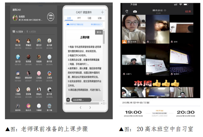 针对系里有学生上网课操作困难问题,建工系老师课前认真准备了上课步骤,手把手教好学生开展好线上学习;针对个别学生上课自觉性不足的问题,全系辅导员积极配合任课老师督促学生按时进课堂学习,第一周建工系学生平均到课率将近达100%;疫情期间课后学习抓牢不放松,2020级高本班级老师协同英语老师开启了空中自习室督促学生学习;针对个别在校学生没有电脑的情况,系领导特地申请加开了综合楼机房,并安排实训员老师协同管理,保障学生开展线上软件课程学习;应对BIM课程需要电脑安装软件,老师特地联系了鲁班公司的专业老师,在班级微信群里指导学生完成软件安装,解答学生的各种问题;专业课所用的广联达软件因为需要软件锁才能使用,为了保证学生学习质量,老师特地与广联达公司联系,给学生加开了虚拟锁。
