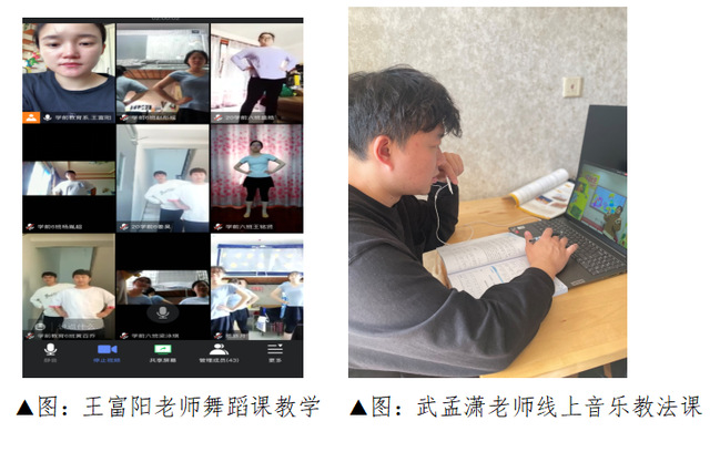 钢琴弹唱课因为学生没有琴无法弹奏,授课教师积极调整教学方案,将把在线课程分为“音乐史的欣赏与讲解”和“儿歌演唱”两部分来完成,并通过课赏析名曲、学生轮流弹唱等方式全面增加学生在音乐方面的综合素养,锻炼学生的演唱能力和识谱能力;舞蹈课程由于课程特殊性,老师和学生所有人都必须克服场地等问题,有的同学在家中上课,有的同学在学校楼道上课,有的同学在宿舍上课,即使有种种困难,同学们对学习热情依旧高涨。老师通过视频进行授课,一个动作一个动作认真地演示与指导,学生们也打开摄像头,在云课堂和老师一起翩翩起舞,即使隔着屏幕认真劲头一点也不少。