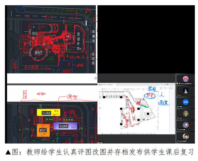 建筑系教师们还及时地开展线上教学分享会,集思广益教学大比拼,教学宋雯珺老师分享了雨课堂新版本的使用小技巧;岳华老师根据设计课特点,分享线上改图经验,记录实践课程的教学过程,提升课堂互动性;丁毅老师分享了如何在雨课堂5.2版本嵌套的腾讯会议中保证每堂课的正常录制经验;黄琪老师分享了结合学堂云进行作业提交和批改的经验。通过相互交流学习,系里的老师共同推进后续线上教学开展更为顺利、更为出彩。