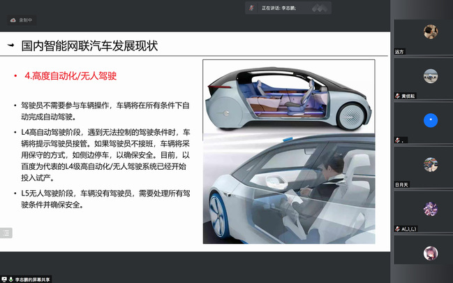 紧接着,李志鹏教授以清晰的专业思路和丰富的实际案例向同学们讲解了智能网联汽车的发展历程以及其在智慧时代的重要作用。依据现阶段发展,给出了智能网联汽车的定义、特征与分级,帮助同学们建立了基本的知识框架。随后,李教授就世界范围内智能网联汽车的发展态势进行了讲解,从技术创新到发展环境再到战略规划,相关成果的产出也标志着智能网联汽车进入了快速发展期。面向未来,李教授强调,电动化、智能化、网联化、共享化将成为我国汽车技术发展方向,聚焦量产与解决新型安全问题将成为主流。