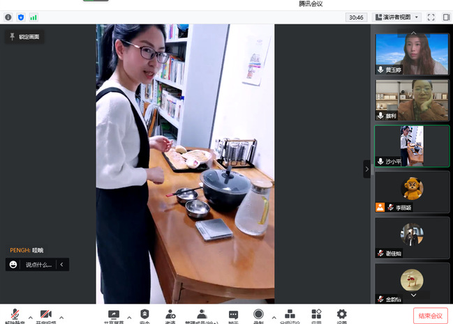 沙小平老师和大家分享了健康低盐的法棍面包及奶茶的制作配方,并亲手示范了制作过程,在家的同学们纷纷表示要尝试制作。黄玉婷老师向大家展示了家中的咖啡的材料和器具,并和大家科普了不同种类咖啡豆的制作原理及食用方式,并得到了不少同学的点赞。蔡利老师则和大家进行了一场有趣的“你画我猜”的小游戏,老师们纷纷表示跟不上同学们的猜题速度。