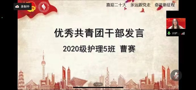 2020级护理5班曹赛同学作为优秀共青团员干部代表发言。她勉励广大济光学子朝着习近平总书记所说的,要树立远大理想、热爱伟大祖国、担负时代责任、勇于砥砺奋斗、练就过硬本领、锤炼品德修为的目标而努力奋斗。