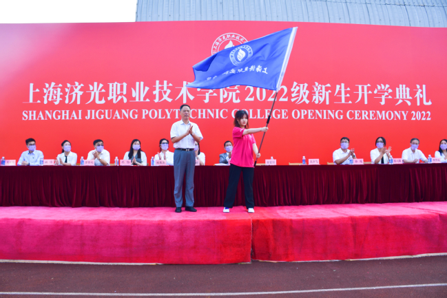 党委书记姜富明向新生代表授旗,希望新生传承好“济光精神”并能够将它发扬光大。
