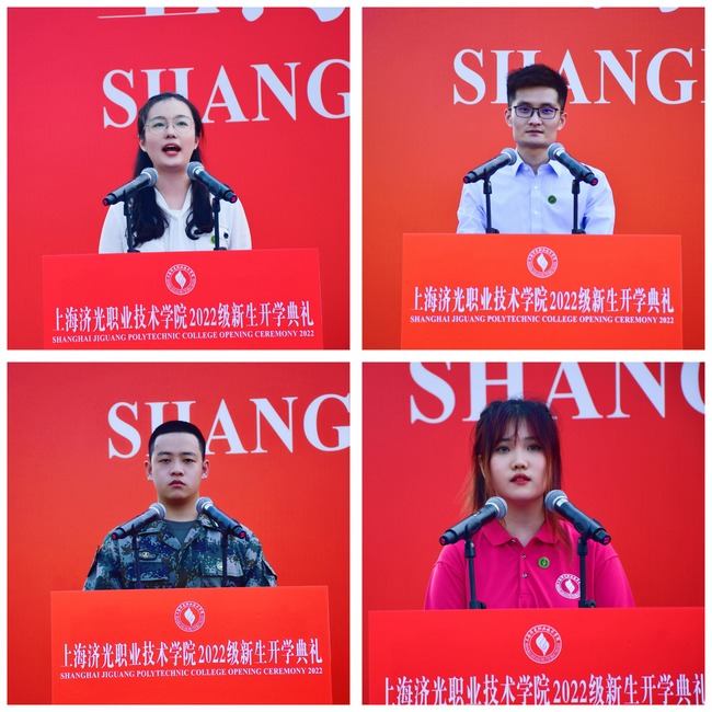教师代表、基础部青年教师马梦晨代表全体教师发言,她表示新同学们要努力学习、健康生活,高质量地度过大学生活,最终学有所成。学前教育系2020级学前教育1班的陆陈嘉澔代表在校生发言,分享了作为一名退伍军人在济光的学习历程和成长收获。2015届经管系会计班毕业生、上海满星财务管理有限公司总经理王庆杨介绍了自己在母校的求学经历、毕业离校后的不懈奋斗,以及对母校的感恩、对新生的祝福;新生代表、2022级护理5班赵康宁代表 2022 级新生表态,在未来的大学生活中,将脚踏实地地走好每一步,不负青春韶华。