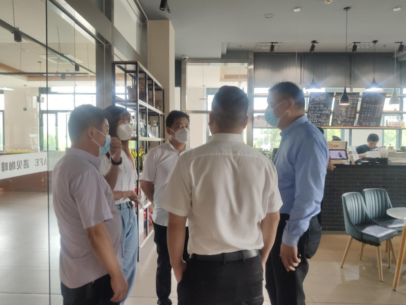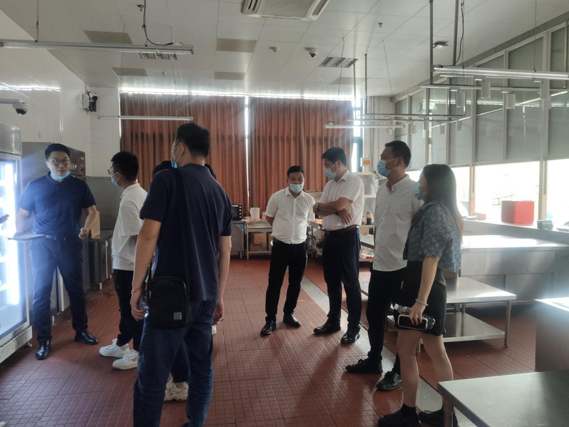 随后,一行人深入餐厅后勤,查看食堂卫生环境及基础设施建设,复旦饮服中心王主任与我校朱洪立副处长交流食堂安全工作及疫情防控措施,双方对提高食堂食品安全保障系数及服务质量等交换宝贵意见。