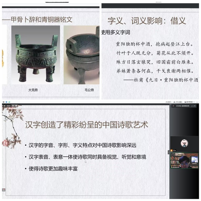 在讲座中,姜老师首先简介了汉字的产生、演变过程和汉字六书,并通过例子展示了汉字内蕴含的文化。通过老师的讲述,同学们不仅了解了甲骨文、金文等文字知识,还知道了与汉字有关的新石器时代文化、著名青铜器等知识,体会到文字对中华文明的重大作用。接着,姜老师从汉字的字音、字形、字义入手,向同学们介绍了汉字是如何对我国诗歌产生重大影响的。她介绍,汉字的字音使得我国诗歌能够押韵,还能用双声、叠韵来修饰音节,也能通过借音形成双关;汉字的字形能直接将诗歌意象展现在读者面前,且衍生出了联边、拆字等趣味诗歌;汉字的一字多义或一词多义又使诗人能巧妙借义。表音表意一体的汉字能使诗歌做到音节、词汇同时工整对仗,将听觉、视觉和意境同时提供给读者,形成音乐美、绘画美,这是世界文化中绝无仅有的。