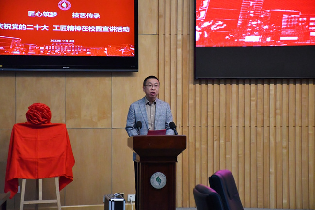 11月2日,我校“匠心筑梦 技艺传承”劳模工匠育人基地揭牌仪式在宝山校区圆形会议室举行。上海市总工会职工技协服务中心主任钱传东,宝山区总工会副主席、党组成员赖拥军,宝山区杨行镇人大副主席、总工会主席阎志军,上海劳模工匠服务队成员上海工匠张治宇、蒋晓东,我校党委书记姜富明出席了仪式,学校有关职能部门、建筑工程学院、二级学院学生代表参加。仪式由副校长、工会主席王云飞主持。