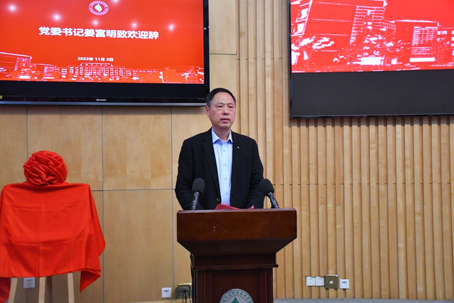 党委书记姜富明为揭牌仪式致辞。他代表学校向上海市总工会职工技协、宝山区总工会、杨行镇总工会领导们的到来表示热烈的欢迎。姜书记表示,济光学院大师工作室有幸能成为上海市总工会首批命名的劳模工匠育人基地,这既是对学校育人工作的认可,也是对济光学院在“三全育人”综合改革的鞭策和激励。近年来,学校坚持以高质量发展为目标,始终坚持彰显专业特色,注重产教融合、校企合作,在教育教学中坚持求实求新、人人成才的办学理念,为社会主义现代化建设培养了一批批高素质技术技能人才。目前,以顾惠明领衔的大师工作室已成为具有济光特色的人才培养示范点。未来,学校要努力把习近平总书记对职业教育“大有可为”的殷切期待转化为职教战线“大有作为”的生动实践,坚定为党育人、为国育才的初心使命,发挥好育人基地的优势,努力培养造就更多有理想的高素质技术技能人才,为实现中华民族伟大复兴作出新的贡献。