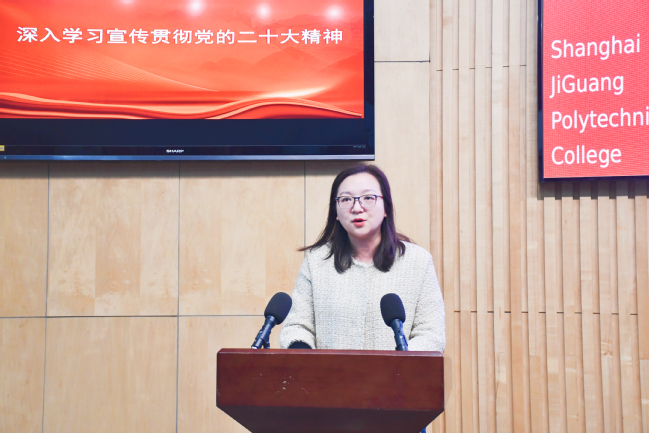 姜富明指出,我们要充分认识学习宣传贯彻党的二十大精神的重大意义;要在全面学习上下功夫,要读原文、悟原理,全面领会党的二十大提出新思想、新论断、作出的新部署新要求;要在全面把握上下功夫,避免知其一而不知其二,知其然而不知其所以然;要在全面落实上下功夫,深刻领悟习近平总书记对新时代新征程教育的基础性、先导性、全局性地位和作用的强调与期待,深刻把握新时代对职业教育提出的新使命,把党的二十大精神贯彻落实到学校改革发展各方面,做到学深、悟透、做实,深刻领悟“两个确立”的决定性意义,不断增强“四个意识”、坚定“四个自信”、做到“两个维护”。