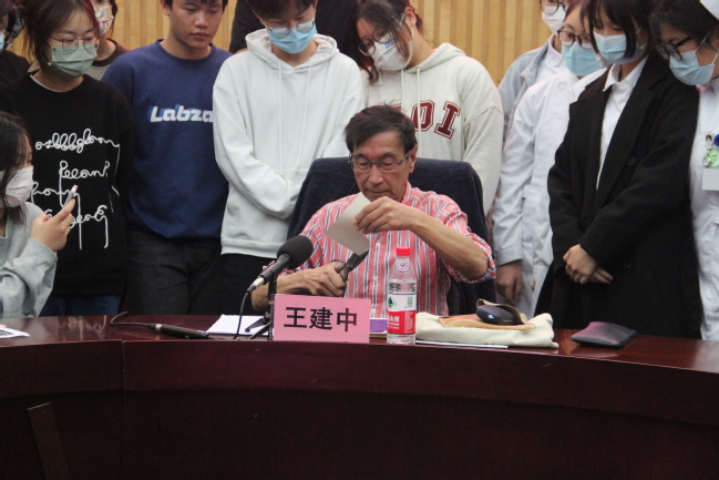 王建中教授的剪纸艺术得于家传。他讲述了剪纸的形成、演变过程和剪纸的南北差异,还特别介绍了海派剪纸的起源。他拿出了家传的剪刀,十分娴熟地在一张普通的彩纸上进行裁剪,一只带着精美花纹的兔子很快就活灵活现地呈现在面前。在剪纸演示过程中,王教授还向学生们介绍了海派剪纸与北方剪纸的不同之处,北方剪纸需要对折裁剪,而海派剪纸却不需要对折,可以直接剪,这也是它工艺的独特之处。不管多复杂的图案在王建中老师的剪刀下都变得栩栩如生,王教授剪了很多精美作品并赠送给了现场学生。在演示过程中,同学们都非常珍惜向非遗大师学习的机会,纷纷尝试,乐此不彼。