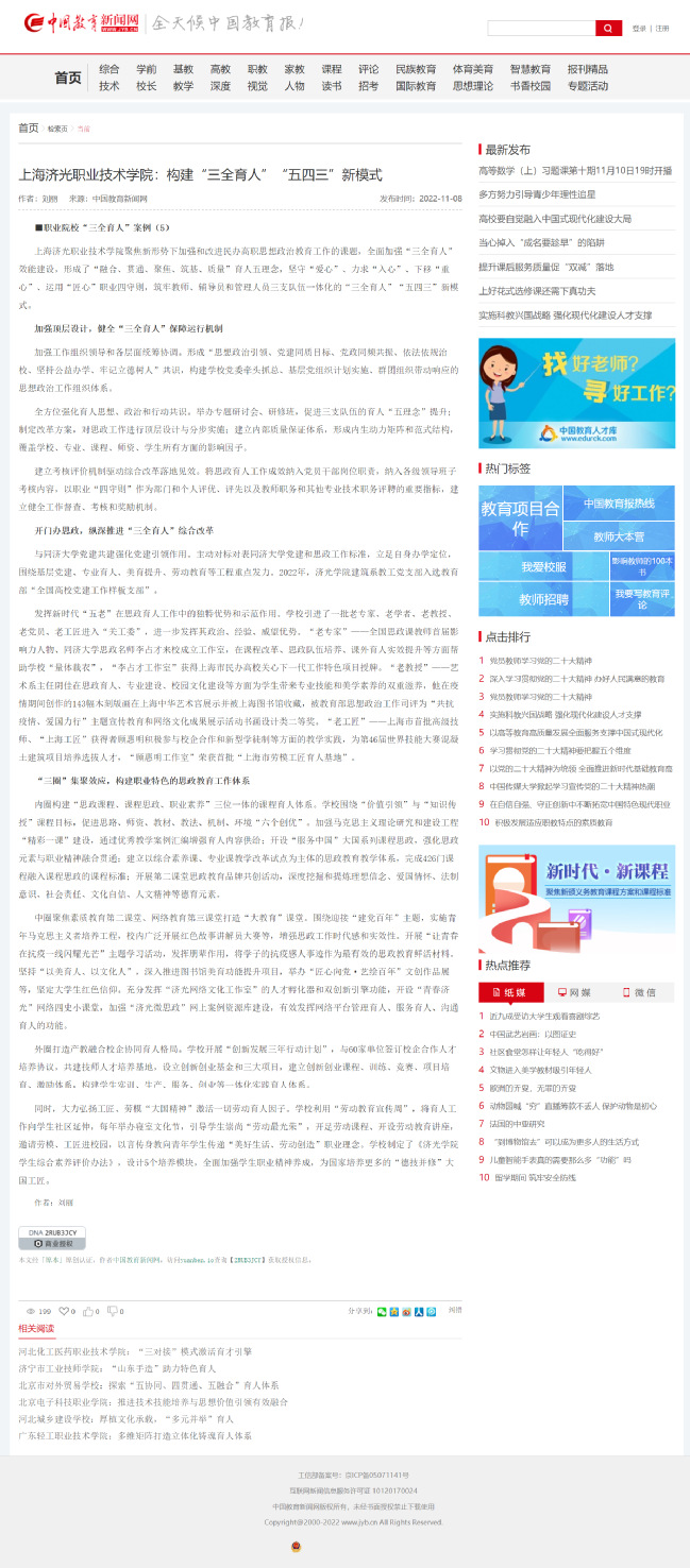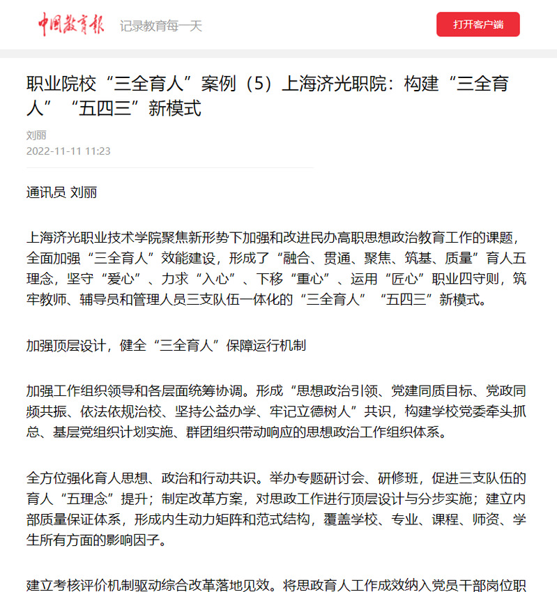 近日,教育部职成司组建专家队伍研定《职业院校“三全育人”典型学校建设指南》,遴选100个“三全育人”典型案例。经各地各校申报、市级推荐和专家审核,上海市共有两所职业院校入选,我校党委宣传部负责申报的“三全育人”典型案例《构建“三全育人”“五四三”新模式》入选,并被中国教育新闻网刊登报道。