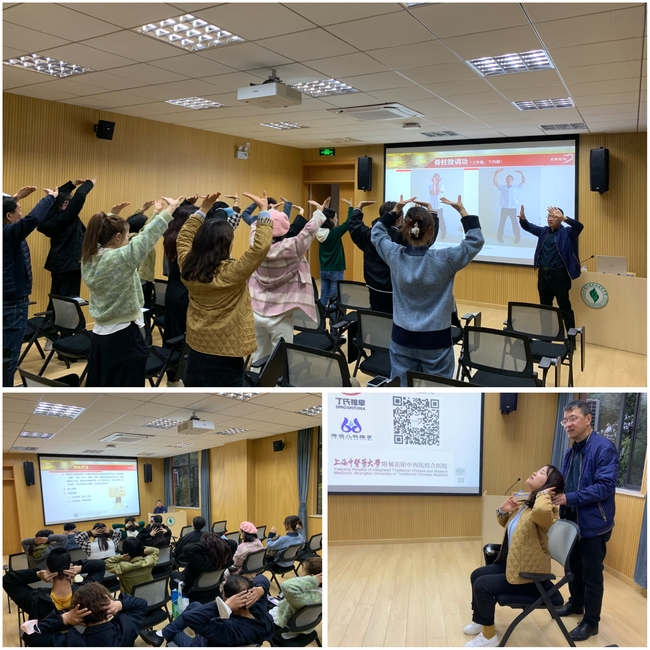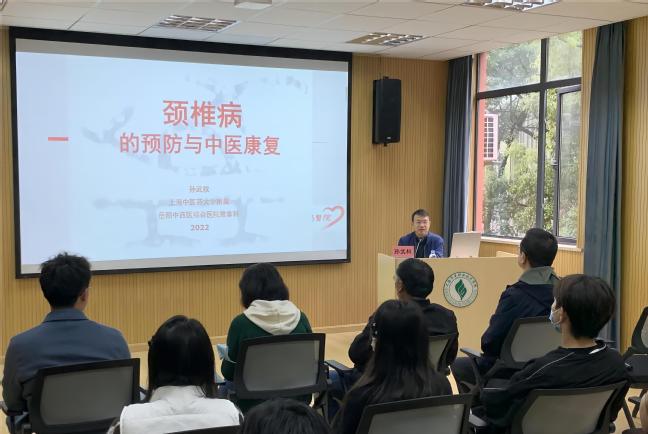 习近平总书记在党的二十大报告中强调:“深入开展健康中国行动和爱国卫生运动,倡导文明健康生活方式。”为倡导文明健康生活方式,在上海市总工会职工技协的协助下,“百名劳模工匠服务千家企业和校园”活动于11月17日来到了济光校园,上海工匠、上海中医药大学附属岳阳中西医结合医院推拿科主任孙武权医生应邀在我校宝山校区图书馆二楼视听室,为教职工作题为《颈椎病的预防与中医康复》科普讲座,讲座由副校长、工会主席王云飞主持。
