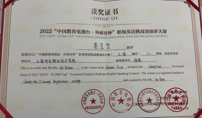 11月4日,“外研社·国才杯”全国英语演讲大赛上海赛区比赛于线上举行。“外研社杯•国才杯”全国英语演讲大赛由教育部高等学校大学外语教学指导委员会、教育部高等学校英语专业教学指导分委员会和外语教学与研究出版社联合举办,已成为最有影响力的大学生英语赛事之一。经过激烈角逐,我校护理专业2022级护理6班蔡昱堃同学荣获了上海赛区的二等奖。