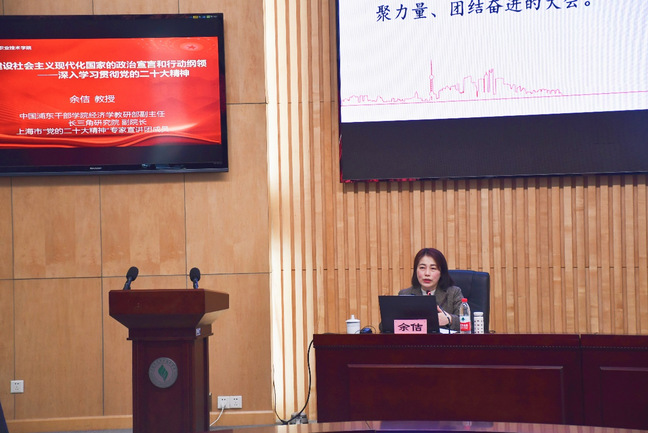 12月2日上午,我校在圆形会议室举行二十大精神学习会,上海市“党的二十大精神”专家宣讲团成员、中国浦东干部学院经济学教研部副主任余佶教授来校作《全面建设社会主义现代化国家的政治宣言和行动纲领——深入学习贯彻党的二十大精神》专题辅导报告。学习会由校党委副书记刘丽主持。