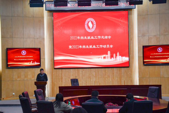 2022年12月8日下午,我校在圆形会议室召开了2022年招生就业工作总结会暨2023年招生就业工作动员会。校长胡展飞、党委书记姜富明、党委副书记刘丽、各职能部门负责人、各二级学院党政负责人、专业主任、全体辅导员出席本次会议,会议由校长助理、招生办主任孙遥主持。