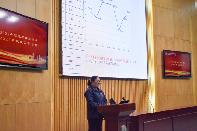 就业指导中心主任杨伟英以《踔厉奋发助推学生顺利就业》为主题对全校就业工作进行了汇报。2022年在学校领导的关心和支持下,在全校上下的共同努力下,截止到8月28日学校就业率达到97.39%,在同类高职院校中排名第三位,较去年同期上升一位。汇报中,她介绍了2022年就业工作的总体情况,各二级学院的特色做法;传达了近期召开的教育部就业工作视频会议的精神;面对2023届高校毕业生就业形势依然严峻复杂的情况,她从就业工作整体前移、加强师资队伍培训、开展毕业生线上就业讲座、帮扶重点特殊群体、打通升学渠道、加大就业宣传力度等方面汇报了2023年就业工作计划。