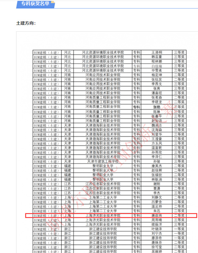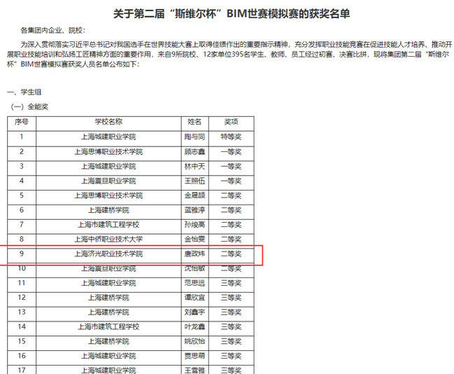 建筑工程学院2020级智能化工程技术专业1班唐政炜同学在2022~2023第一学期顶岗实习期间,积极参加学校方以及实习单位方的比赛,参与多个赛项,在实习单位中森建筑与工程设计顾问有限公司企业带教老师王思凡与学校实习带教老师俞嘉的指导下最终获得了多个奖项,获奖情况如下: