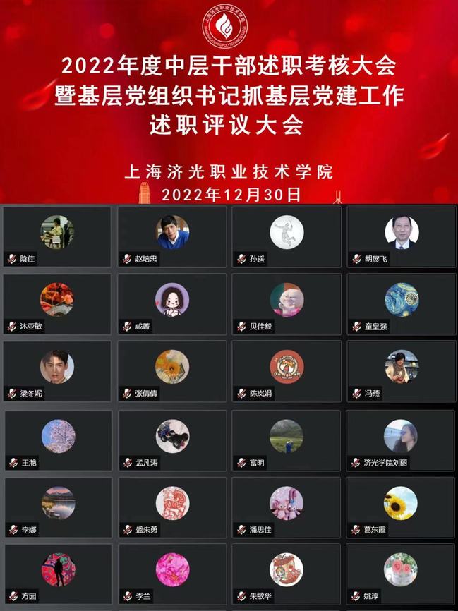 12月30日,学校通过腾讯会议室线上召开2022年度中层干部述职考核大会暨基层党组织书记抓基层党建工作述职评议大会。校长胡展飞、党委书记姜富明、党委副书记刘丽、副校长王云飞以及全体中层干部、各基层党组织书记及各单位教职工代表参加大会。会议由党委副书记刘丽主持。