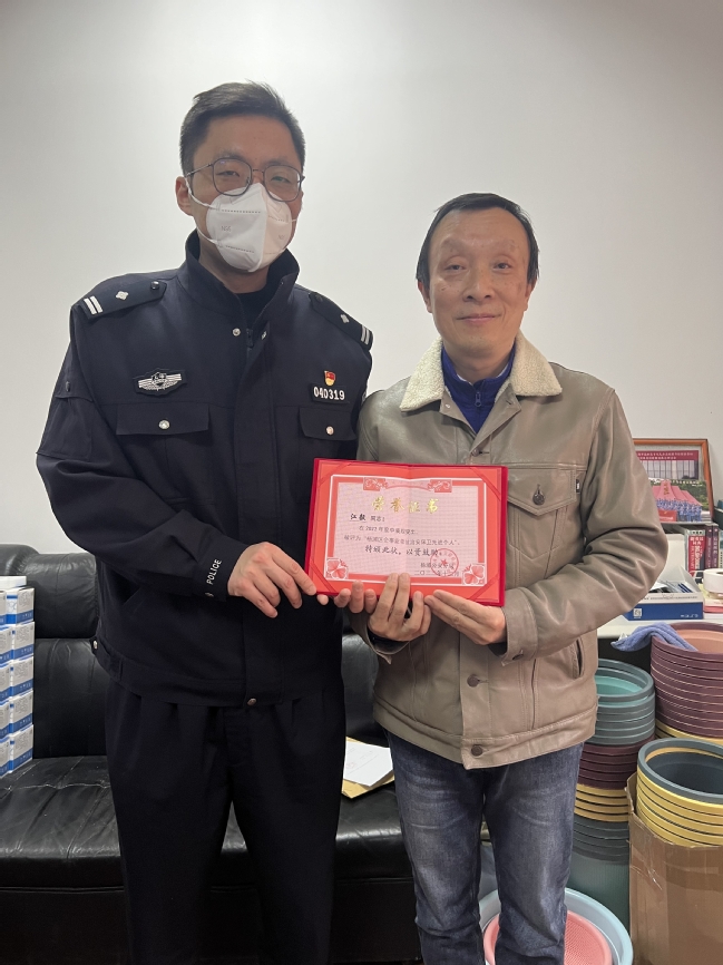 我校杨浦校区管委会江毅副主任荣获“2022年度杨浦区企事业单位治安保卫先进个人”荣誉称号,近日五角场派出所施所长会同分管高校工作的孔警官一起来我校为江毅老师颁发荣誉证书。江毅老师已经连续2年荣获此殊荣,五角场派出所领导充分肯定了江毅老师在杨浦区高校治安管理工作中取得的成绩,也体现了我校杨浦校区全体师生在杨浦区高校治安管理中优良的作风。