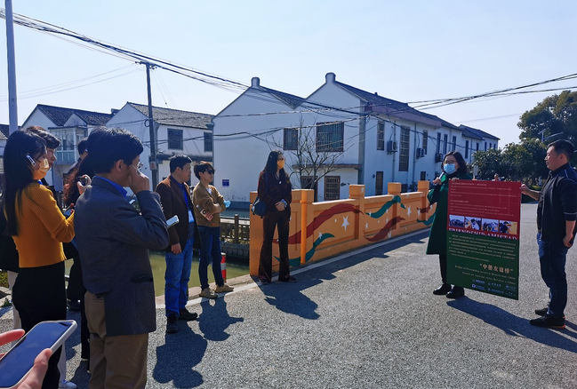 3月10日下午,上海社会主义学院30位学员参观访问上海市松江区新浜镇文华村,我校设计创意学院教师杨奕彤作为文华村“庆祝中墨建交50周年”友谊桥桥绘图案的主要设计者,向来宾们现场介绍了桥绘设计思路和活动展开过程。现场来宾反响热烈,积极互动提问,表现出对民间外交活动与新农村建设相结合、“讲好上海故事”的优秀案例浓厚的兴趣。