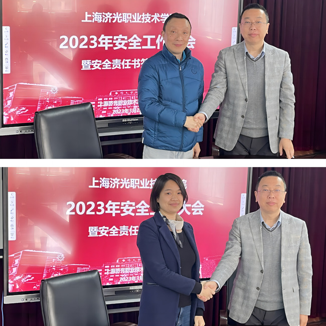 人工智能学院、信息中心、学前教育学院和杨浦校区管委会对本部门的安全工作进行了交流发言。王云飞副校长代表学校与各二级学院、各职能部门签订了校园安全责任书。