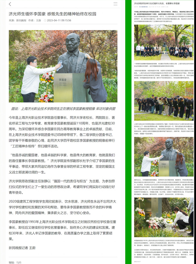 东方教育时报在4月10日以《济光学院师生举行仪式缅怀大先生、老董事长李国豪》为题,新民晚报在4月11日以《济光师生缅怀李国豪 感慨先生的精神始终在校园》为题,对我校师生赴同济大学四平路校区李国豪教授的铜像前举行“工匠精神永相传”祭扫缅怀仪式进行了专题报道。