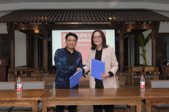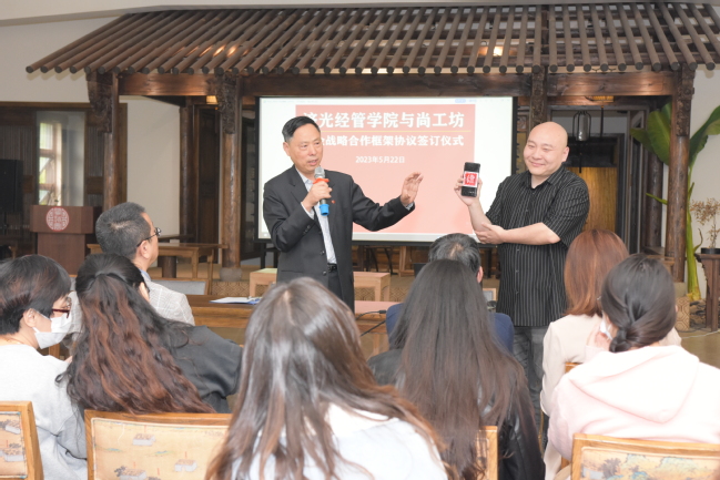 闻道园尚工坊邱俊和经管学院院长张迺英签订校企合作协议,标志着济光经管学院与尚工坊校企战略合作正式达成。张迺英在讲话中提到:感谢学校工会提供此次合作的平台、感谢设计创意学院和尚工坊给予的合作机会,欢迎尚工坊入驻经济管理学院工作室,相信尚工坊的创新理念定会带领学生通过直播的方式将创意推向市场,促进电商专业的文化创意发展。