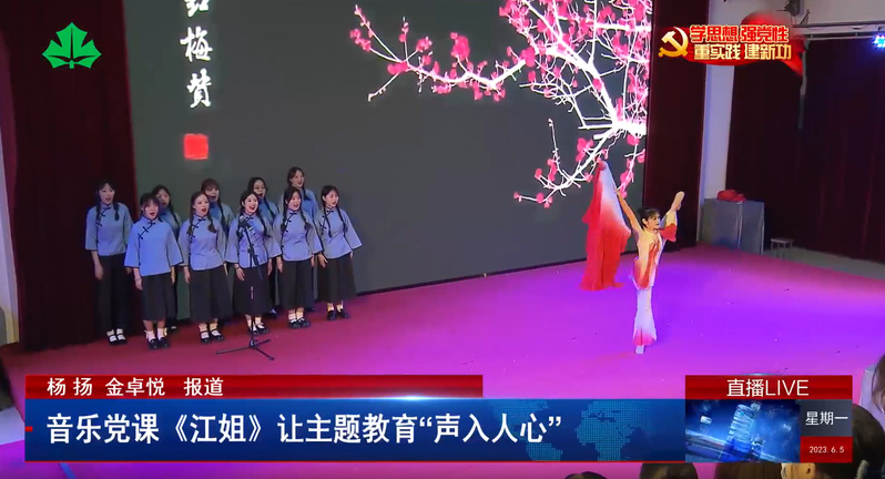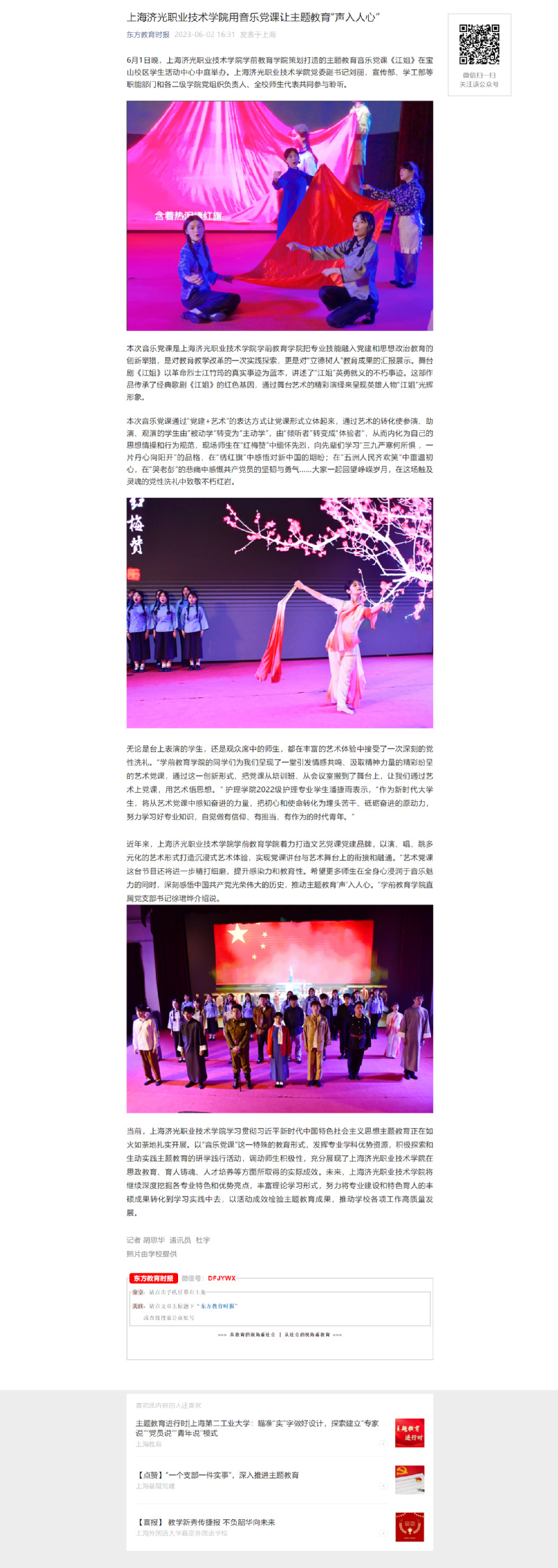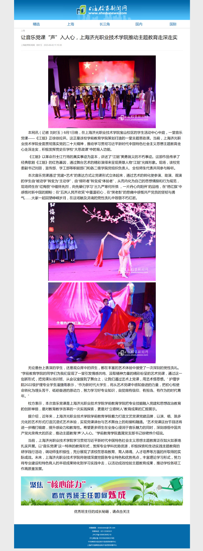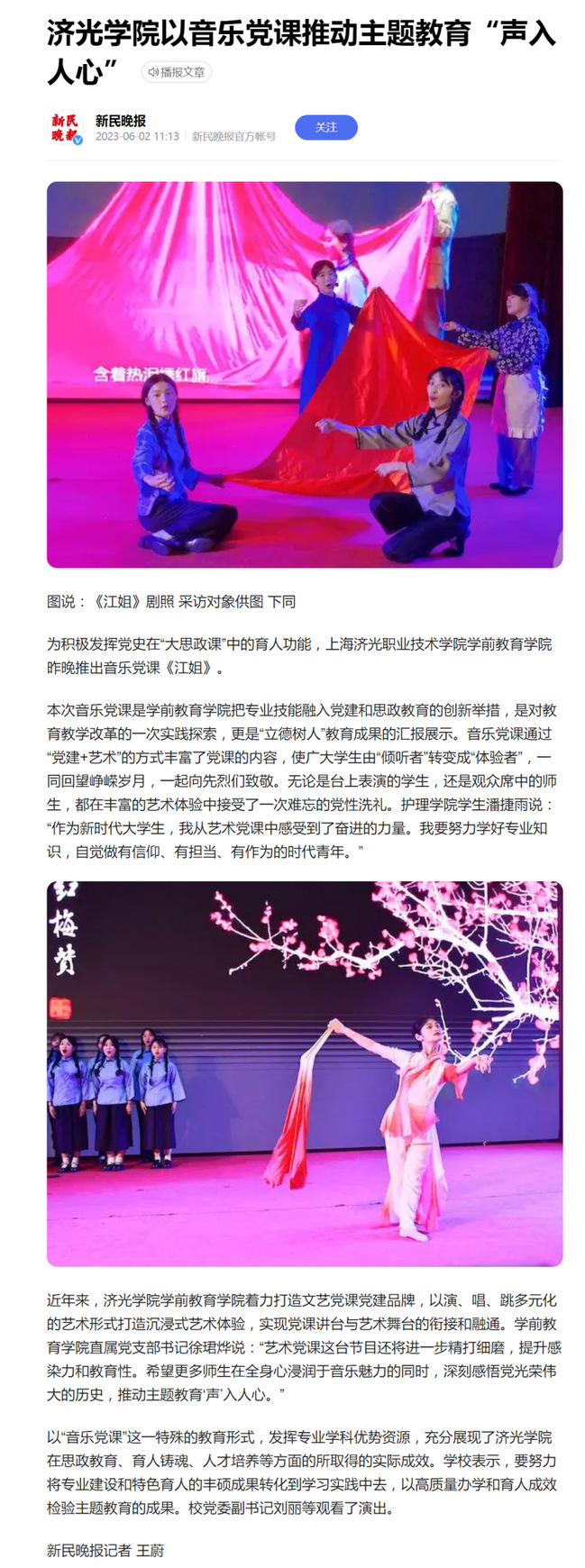 6月2日,《新民晚报》在以《济光学院以音乐党课推动主题教育“声入人心”》为题、《东方教育时报》以《上海济光职业技术学院用音乐党课让主题教育“声入人心”》为题、上海教育新闻网以《让音乐党课“声”入人心,上海济光职业技术学院推动主题教育走深走实》为题,上海教育电视台教视新闻6月5日以《音乐党课<江姐> 让主题教育“声入人心”》为题对我校开展主题教育音乐党课《江姐》进行了专题报道。