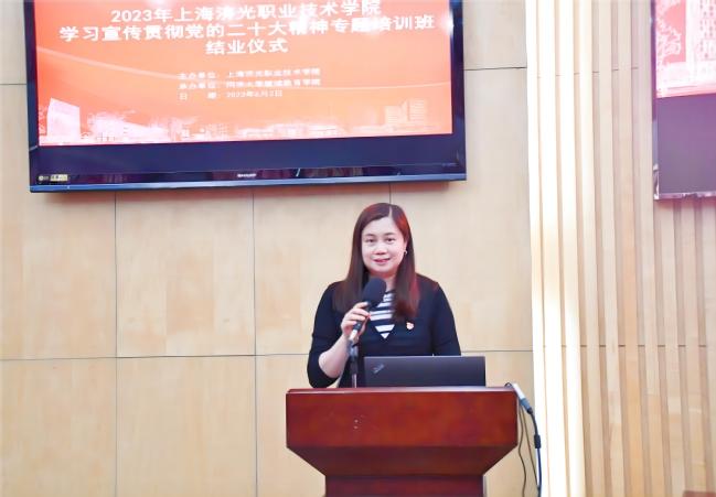 学习会结束后,举行了2023年党员、干部和教师学习宣传贯彻党的二十大精神专题培训班结业仪式。学员小组代表上台领取了结业证书。人居环境与建筑设计学院院长岳华作为学员代表上台发言,她表示历时两个多月的学习和研修,是一次全方位的学习与提升,衷心感谢学校领导与同济大学的精心组织和支持。