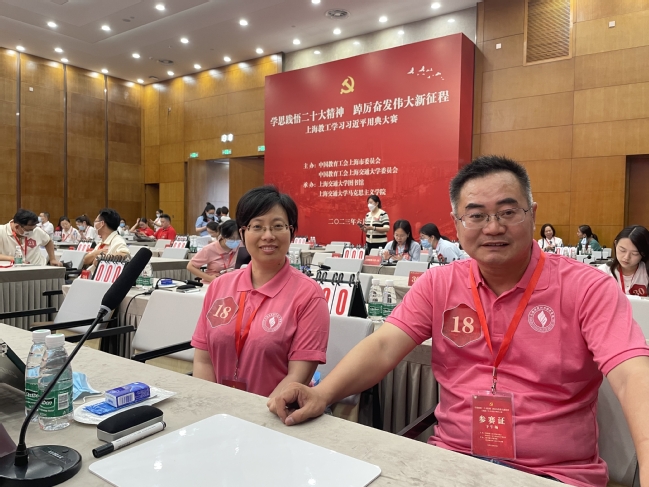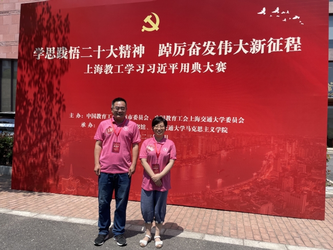 由上海市教育工会、交通大学主办的“学思践悟二十大精神 踔厉奋发伟大新征程”2023年上海教工学习习近平用典大赛复赛于2023年6月10日,在交通大学闵行校区举行。我校工会选派基础部姜黎黎老师和思政部刘松老师参加了本次比赛。来自全市教育系统各单位的96支参赛队伍,326名选手汇聚交大,同台切磋。
