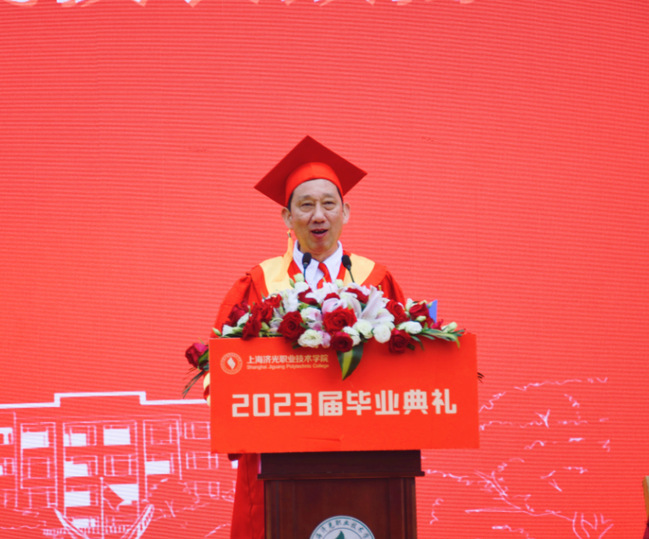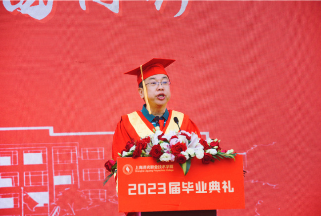 校长胡展飞作题为《让青春绽放在中国式现代化建设的伟大实践中》毕业致辞,并代表全体教职员工向毕业生们表示热烈的祝贺。他指出,同学们在学校的三年,筑梦致远、弦歌不辍、屡结硕果、收获满满,用实际行动诠释着青年的担当,践行着青春的使命,是可挑重任、能挑重任的一代。胡展飞校长对全体毕业生提出殷切希望,希望大家未来要继续怀揣梦想,秉承“求实求新 人人成才”的校训,用实际行动践行“强国有我”的铮铮誓言,书写无愧于伟大新时代的青春篇章;希望同学们传承济光精神,彰显青年担当,练就过硬本领,以无悔青春之我,担国家强盛之责,以勇担使命的魄力、战胜困难的毅力、激情澎湃的活力,面对未来的各种机遇、风险和挑战,在以中国式现代化全面推进中华民族伟大复兴的新征程上贡献智慧与力量。