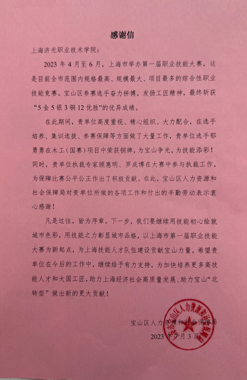 信中写道,在上海市第一届职业技能大赛举办期间,上海济光职业技术学院充分发挥“立德树人、强技乐业”的办学理念,校领导高度重视、精心组织、大力配合,在选手培养、集训选拔、参赛保障等方面做了大量工作。经过层层比赛,郁勇勇老师在木工(国赛)项目中荣获铜牌,为宝山争光,为技能添彩;上海济光职业技术学院执裁专家顾惠明、罗成博老师在大赛中参与执裁工作,为保障比赛公平公正作出了积极贡献。