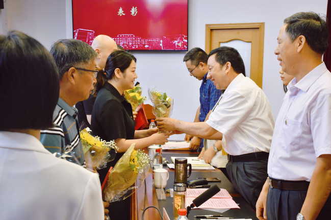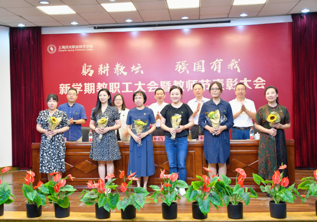 刘丽副书记会上宣读了《上海济光职业技术学院关于表彰2022-2023学年校“优秀教师”“优秀辅导员”“先进教育工作者”的决定》,校领导对获得校内“优秀教师”“优秀辅导员”“先进教育工作者”的教职工颁发了荣誉证书,为2022-2023学年获得市级以上荣誉的教职工代表献花。