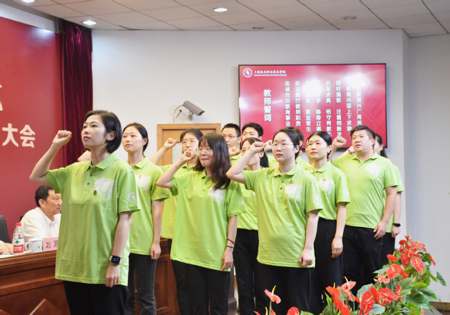 新进教职工在会上进行了优秀教师领誓、新教师宣誓仪式。在“优秀教师”代表段文婷老师的带领下,新教师们立下铮铮誓言,铿锵有力、整齐坚定,深深表达了新一代济光人牢记教育使命的坚定意志和决心。